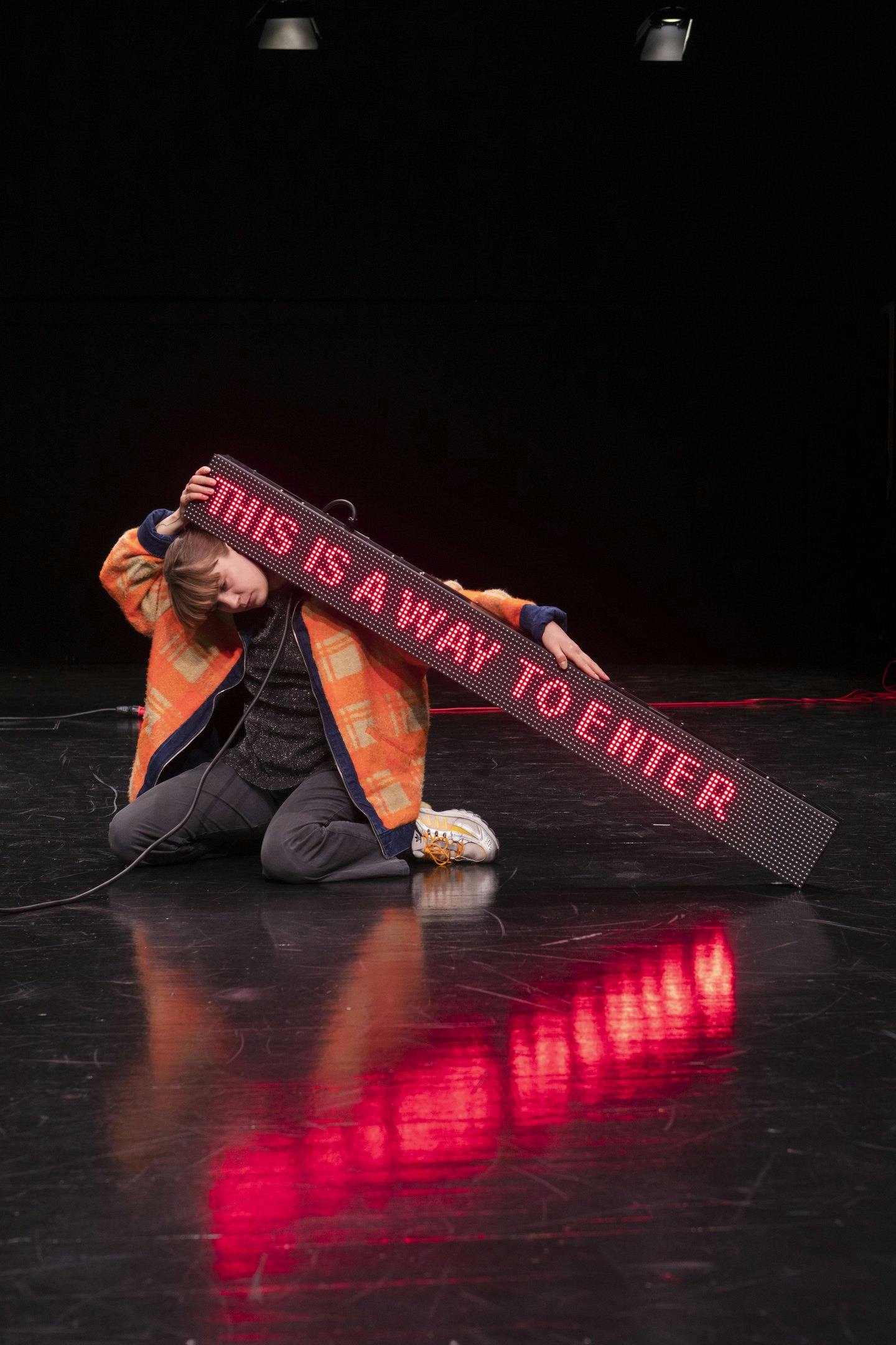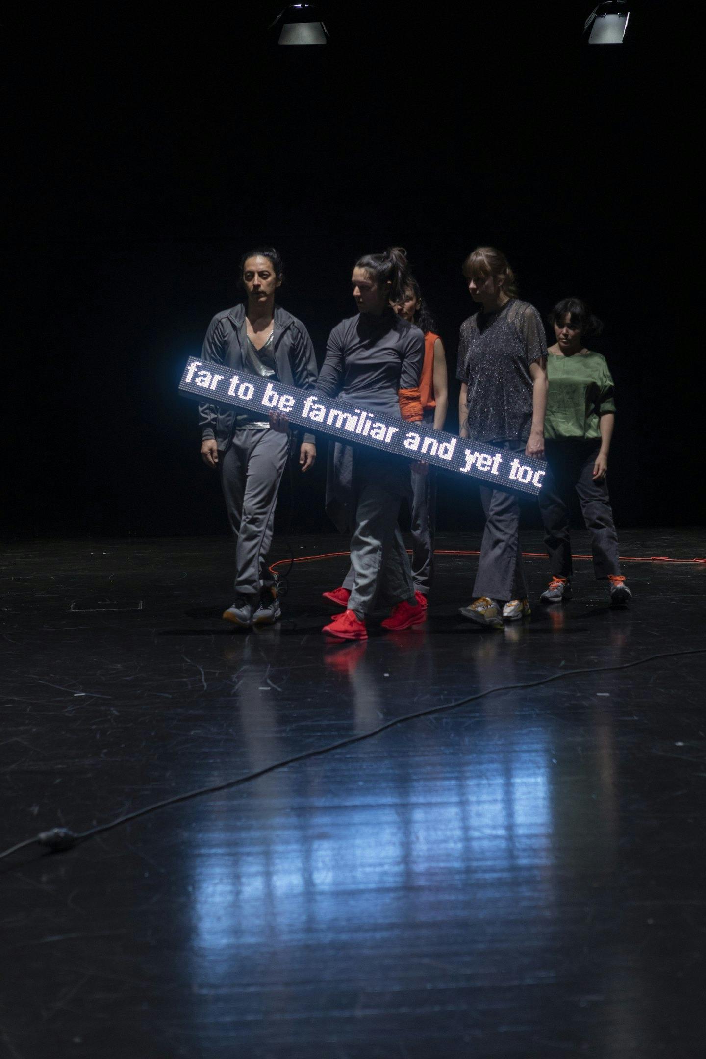 The LEDs, usually encountered in public spaces as low-key advertisement signs, become vessels to convey how language influences mobility. Navigating between tourism slogans and visa questionnaires, the dancers –who carry experiences of migration and displacement between countries– interact with the text scrolling on the LED panels. As the words move on the screens, they are also moved by the bodies. Meanings unfold and borders slowly blur: who can stay and who must leave? Who is seen and who remains hidden? What is allowed and what is forbidden?